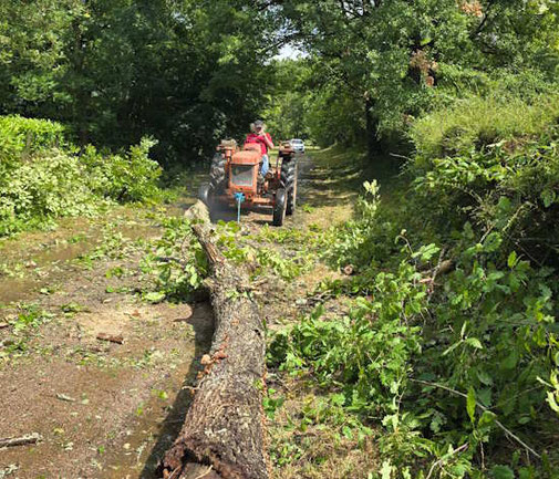 Le site de l’aire de loisirs ne fut pas épargné ! Bertrand, inquiet de la situation, pouvait découvrir un enchevêtrement de branches à terre et d’arbres cassés sur le site, tombés sur la guinguette, autour de l’étang, sur l’aire de pique-nique… Avec les voisins présents et Laurent Bourtourault, eux aussi touchés, les arbres qui bloquaient la circulation chemin du viaduc et route de la forêt furent tronçonnés. Lundi après-midi, une petite équipe de volontaires était en place avec tracteur, remorque, râteaux, fourches et bras. Quatre remorques surchargées ont été remplies et conduites à la verse. Il fallait tout cela pour… y voir plus clair et redonner un aspect accueillant au site. Même s’il reste encore beaucoup de travail avec les saules de l’étang, le F’estival pouvait malgré tout avoir lieu dans un cadre plaisant.