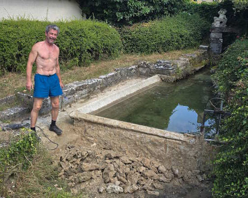 Avec l'aide des jeunes Cullois embauchés pour l'été (Salomé et Zac), Philippe a dégagé le lavoir des Ouches de la gangue de calcaire qui s'est accumulée dans l'année passée.